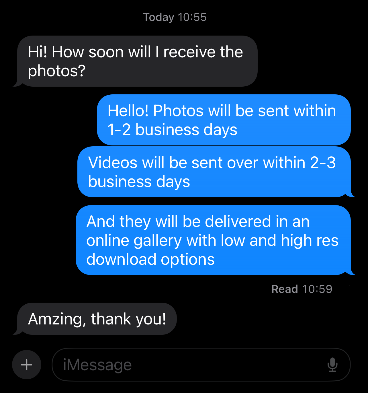 If your shoot date was on a Mon - Thurs, photos will be delivered the next business day. Videos will be delivered within 2-3 business days.